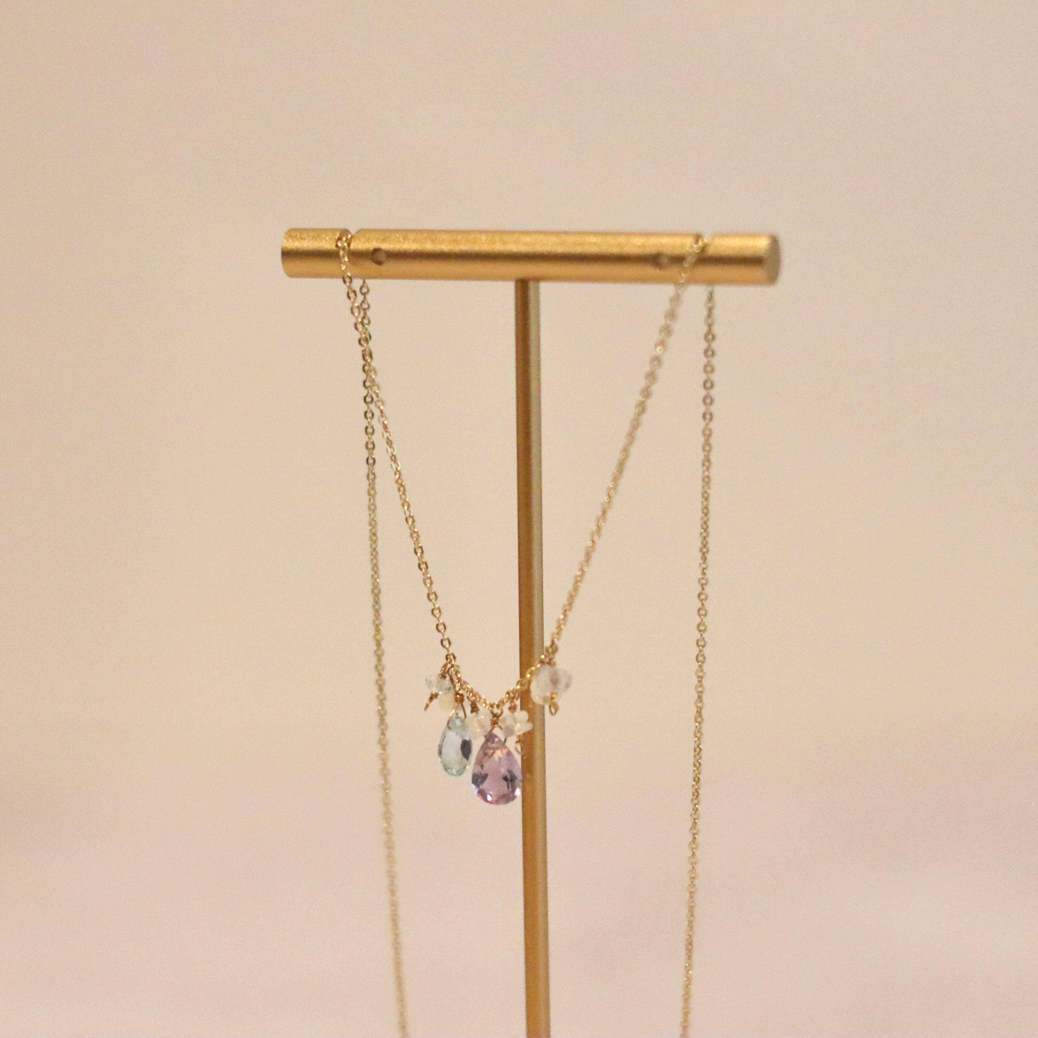 淡い色味の天然石を重ね合わせた透明感溢れるネックレスです。