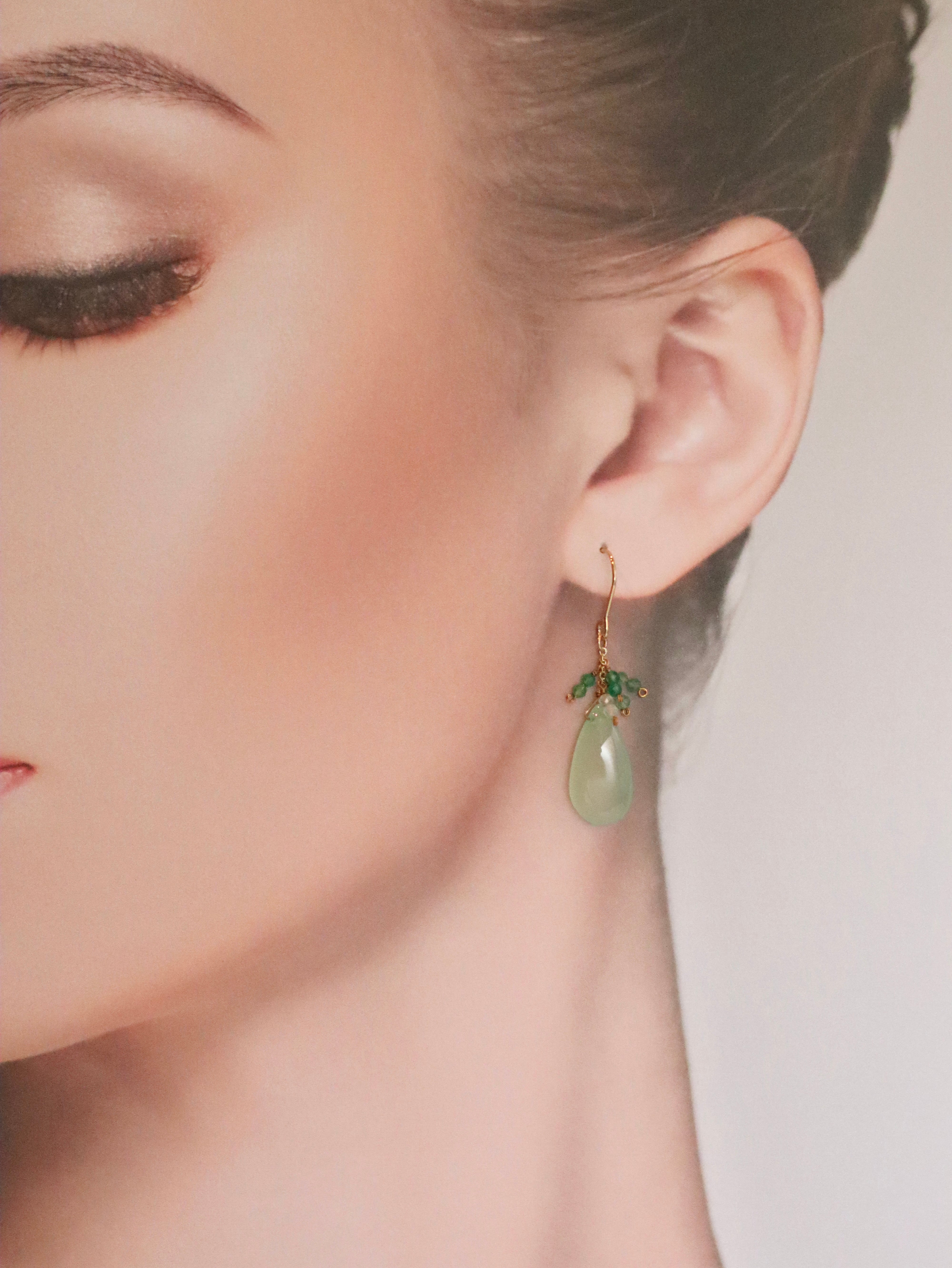 艶やかで柔らかいライトグリーンカルセドニーに、小粒のグリーンオニキスを合わせたイヤーアクセサリー。透明感のある優しいグリーンが揺れ、耳元に爽やかな輝きを添えてくれます。