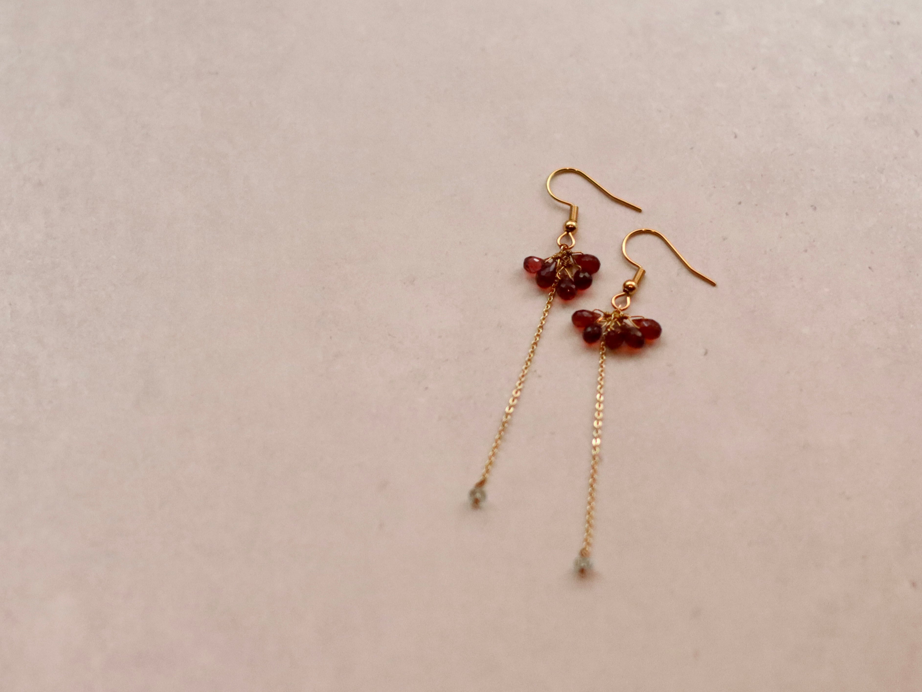 深い赤色のガーネットに、透明感のあるアクアマリンをアクセントに合わせたイヤーアクセサリー。華奢なチェーンが揺れ、動くたびにさりげないきらめきを耳元に添えてくれます。