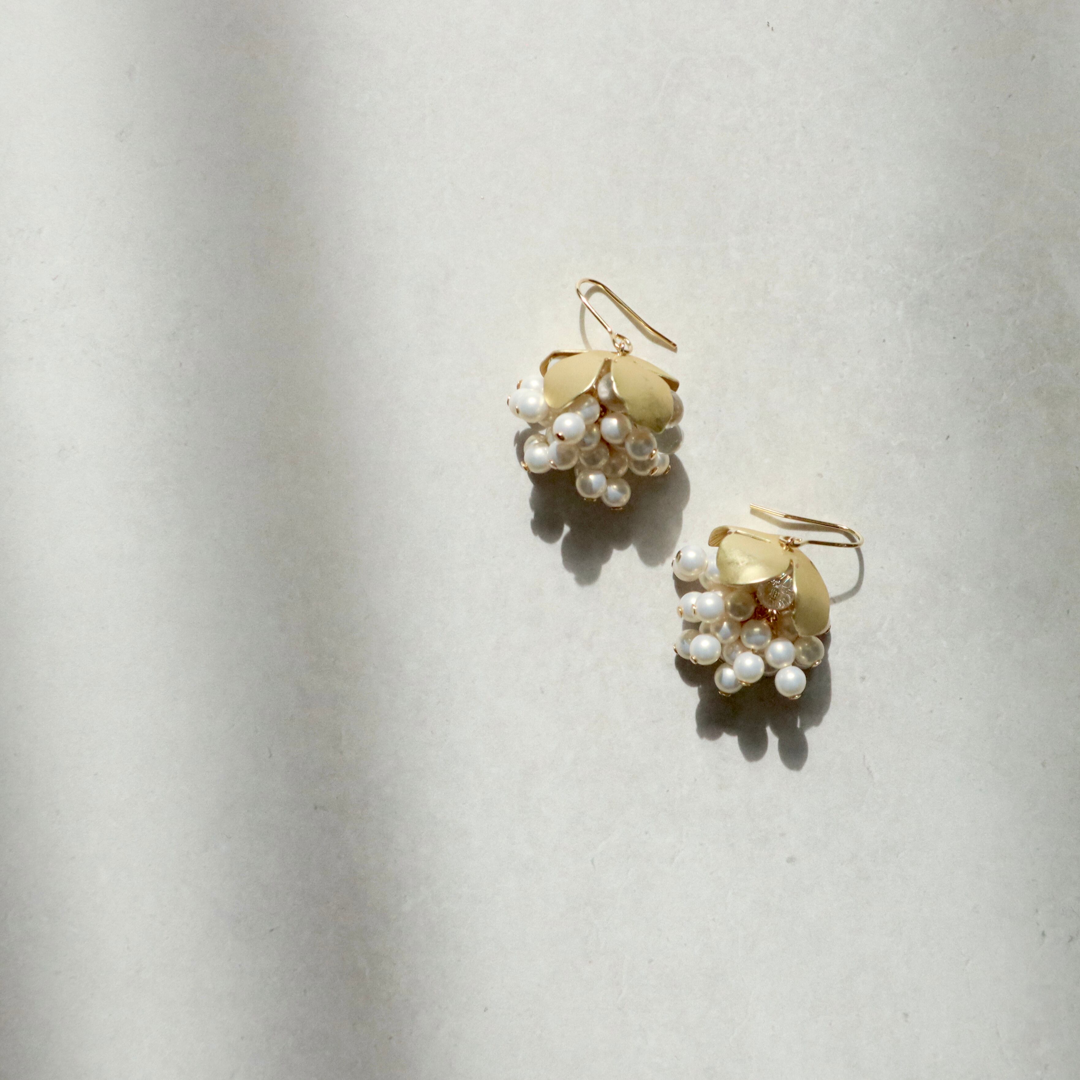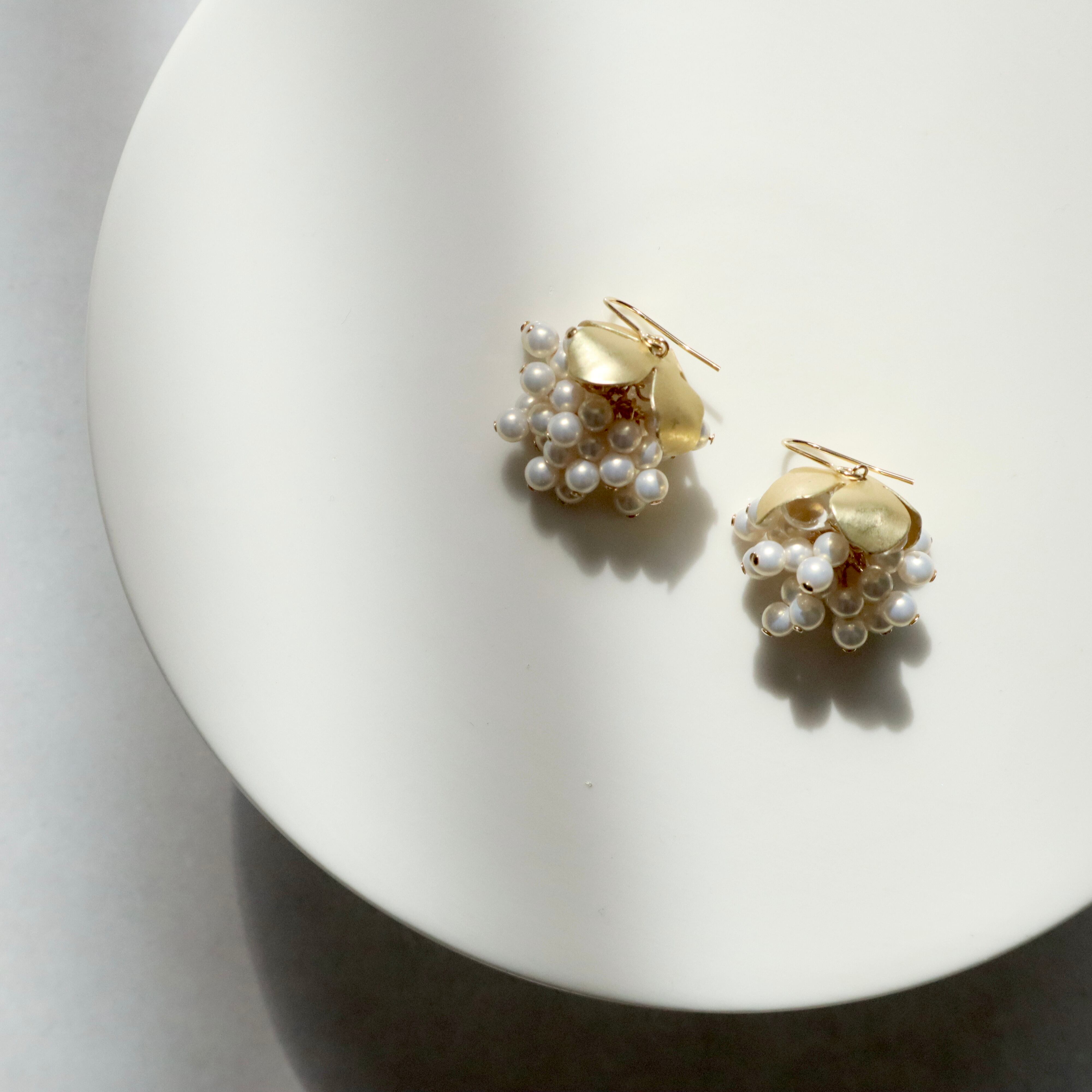 お花のパーツの中にたっぷりのパールと透明感溢れるpurunパーツを、ぎゅっと詰め込んだイヤーアクセサリー。程よいボリューム感と華やかさのバランスを大切にどんなお洋服でも合うデザインしました。