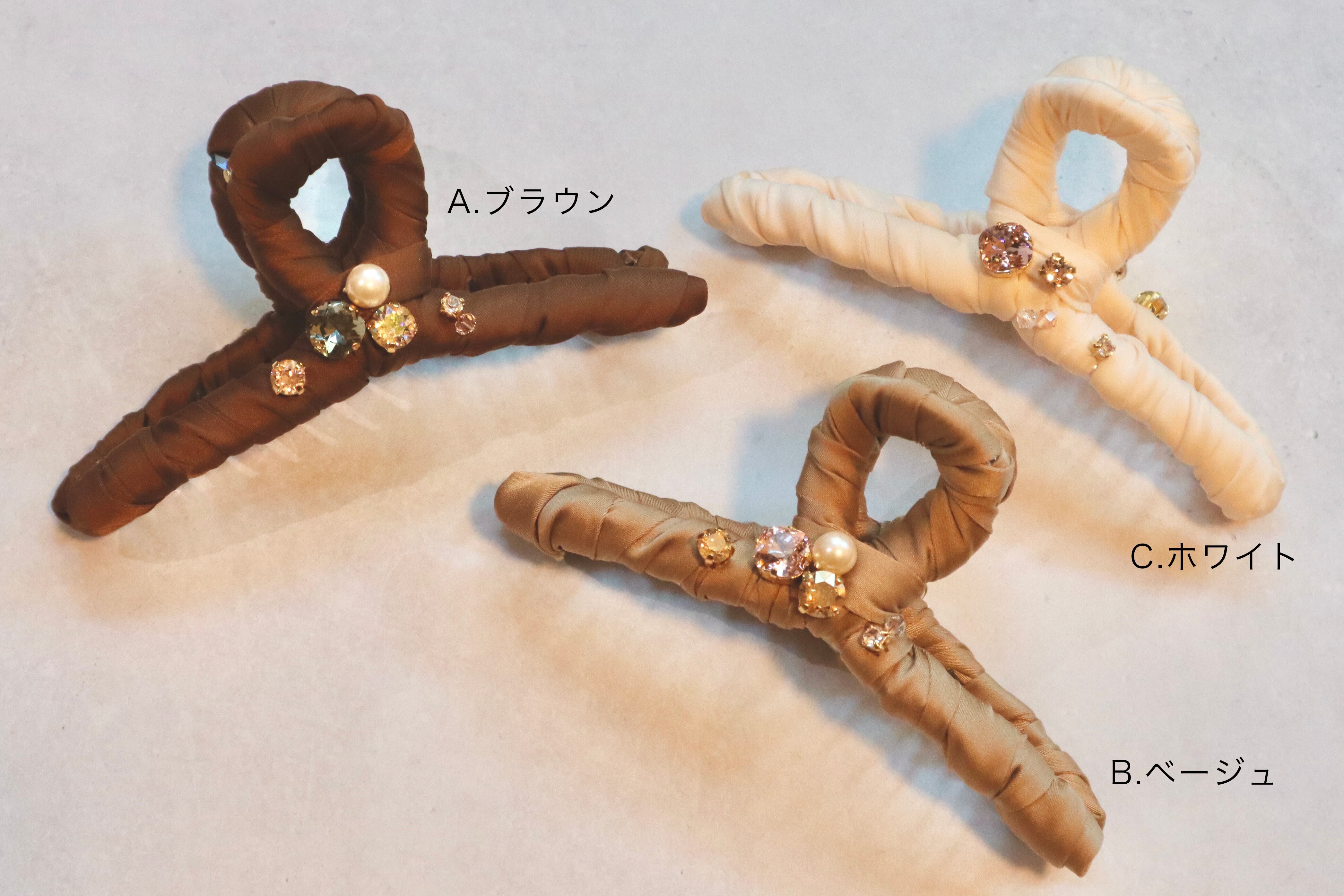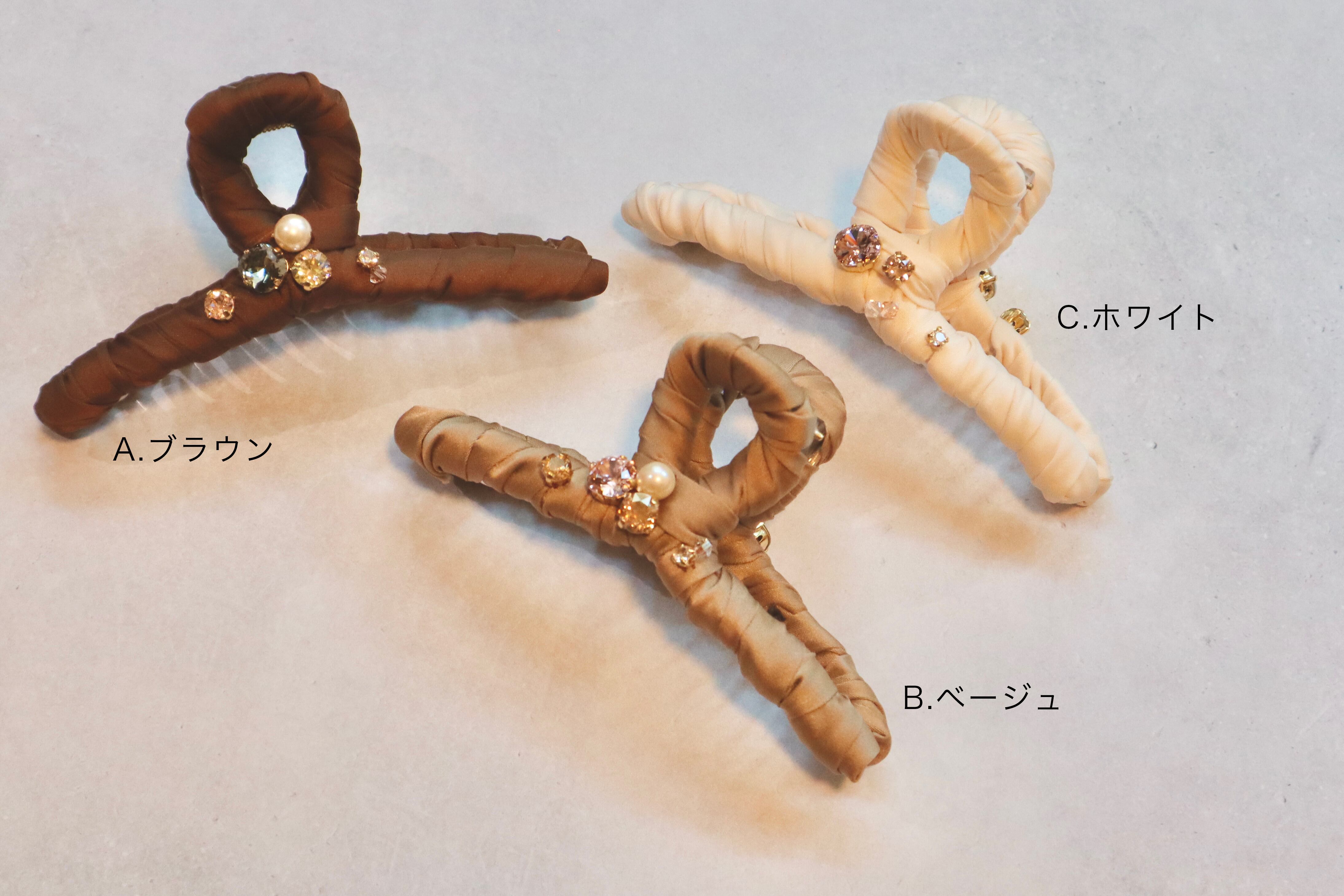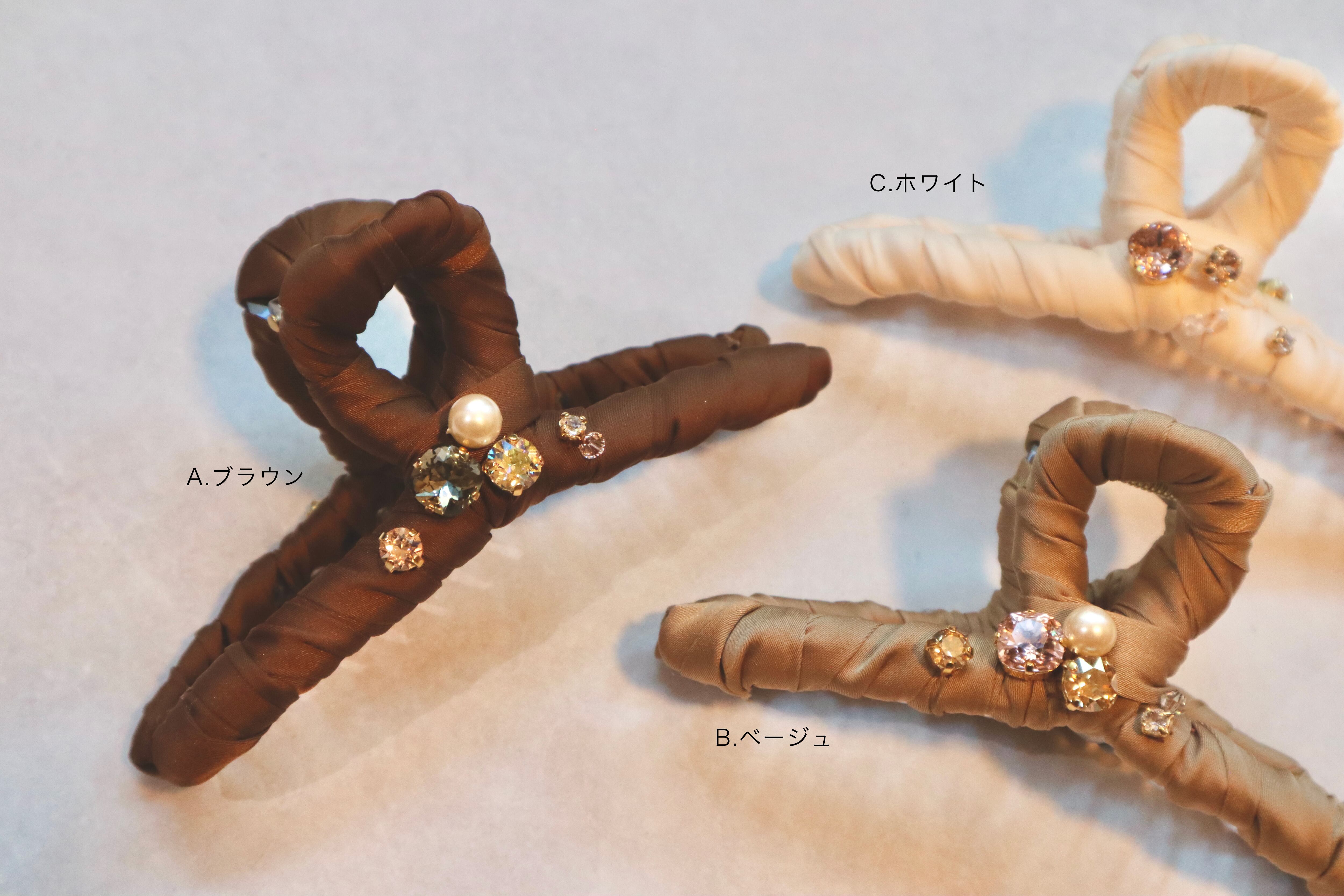 一つ一つリボンを巻き、スワロフスキーやパールを付けて華やかに仕上げたヘアアクリップ。