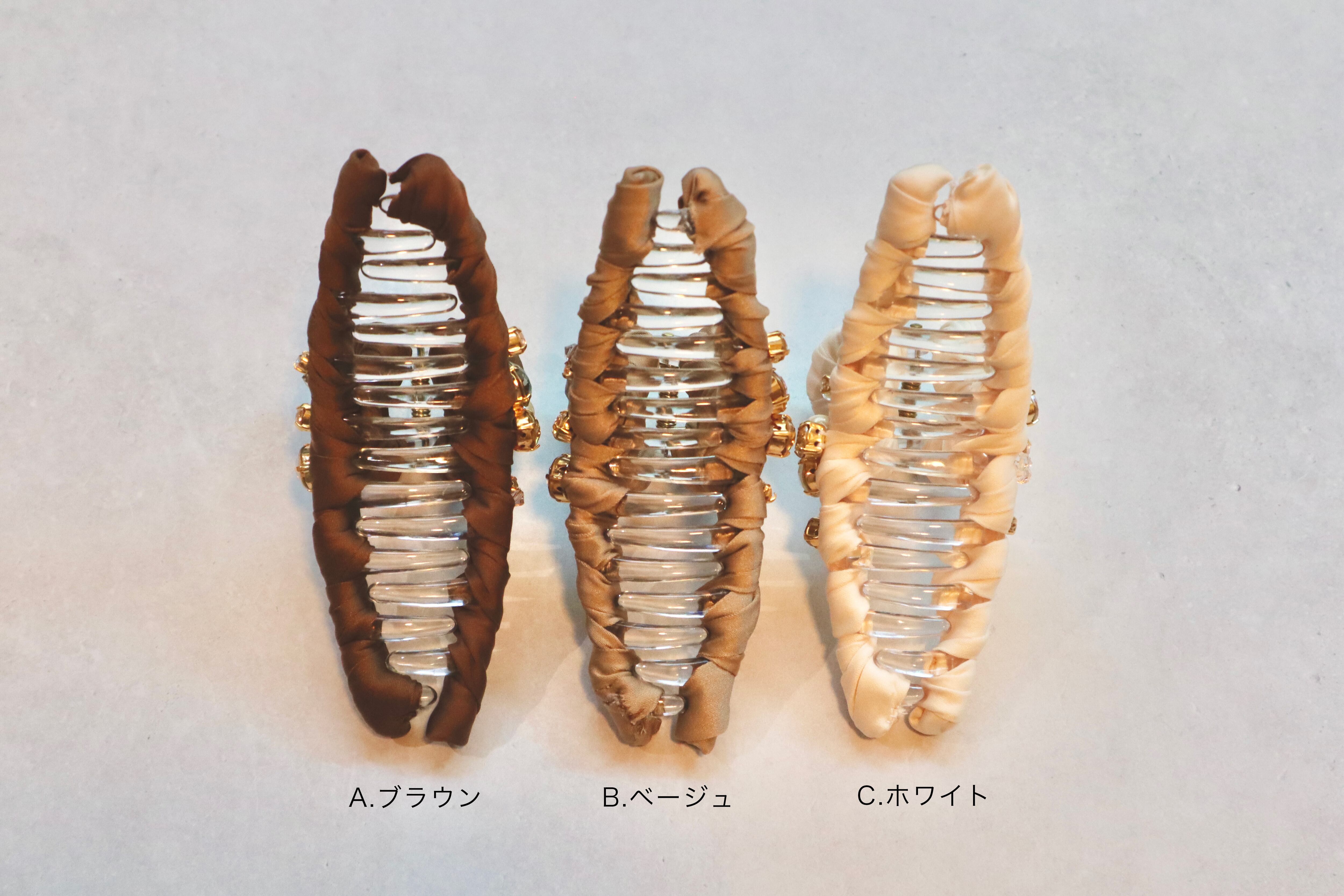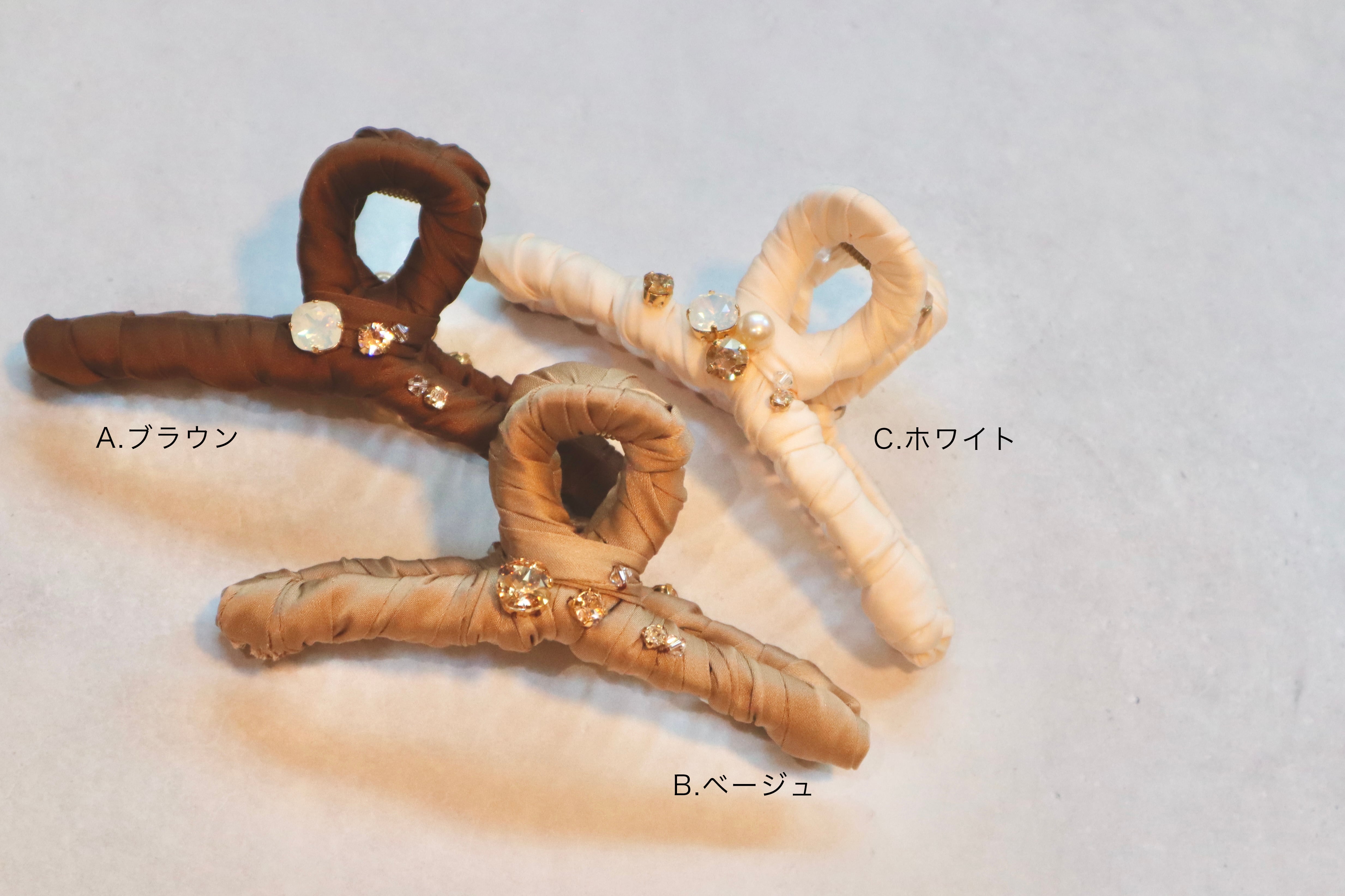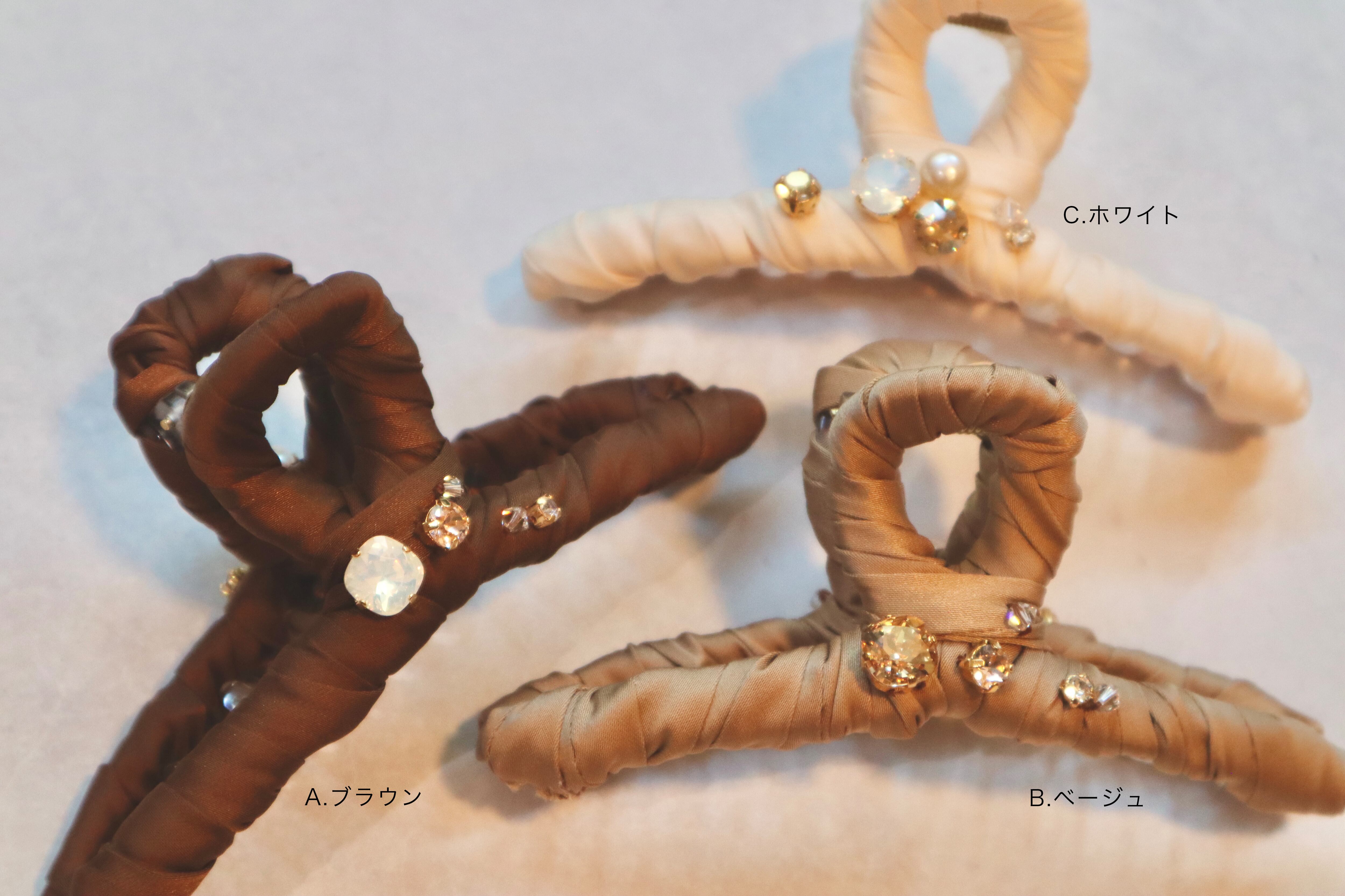 一つ一つリボンを巻き、スワロフスキーやパールを付けて華やかに仕上げたヘアアクリップ。